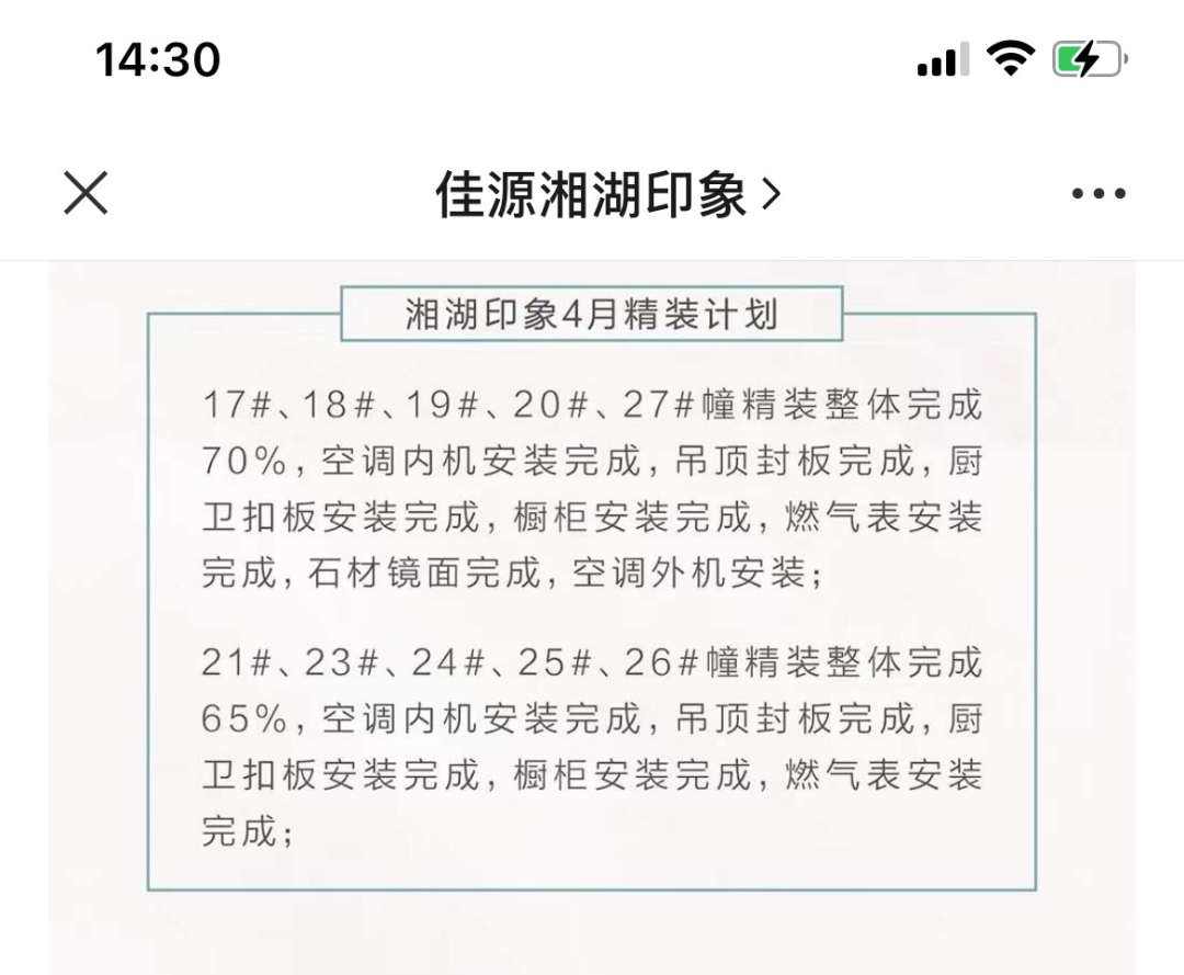 但从佳源湘湖印象今天官微发布的工程进度展示得知,28号楼精装完成100%,已交付;而17-27幢高层的精装施工完成70%,并列好了4月的室内的装修计划。