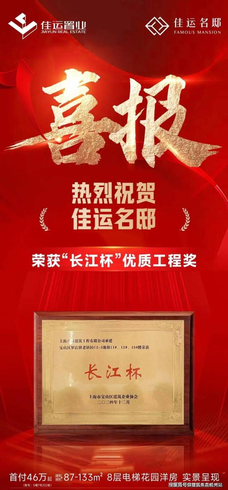 近期,佳运名邸荣获了由宝山区建筑企业协会颁发的“长江杯”优质工程,收获了来自购房者和行业人士的高度认可。