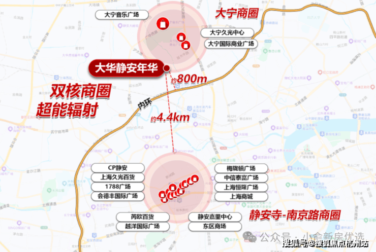 而大华静安年华,正落子 大宁板块更靠近内环的黄金C位 ,以 约800米直抵内环的稀缺站位,独享双核商圈超能辐射 。(距离来源百度地图)