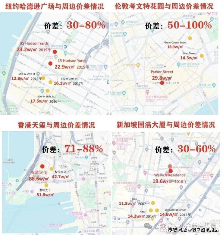 我们来看几个享誉全球的成功案例, 纽约哈德逊广场,伦敦考文特花园,新加坡国浩大厦,香港天玺 ,这些顶级公寓都有一些共性点: