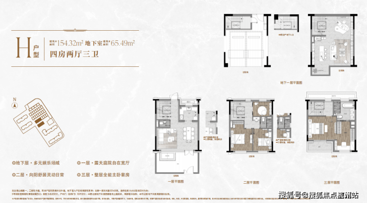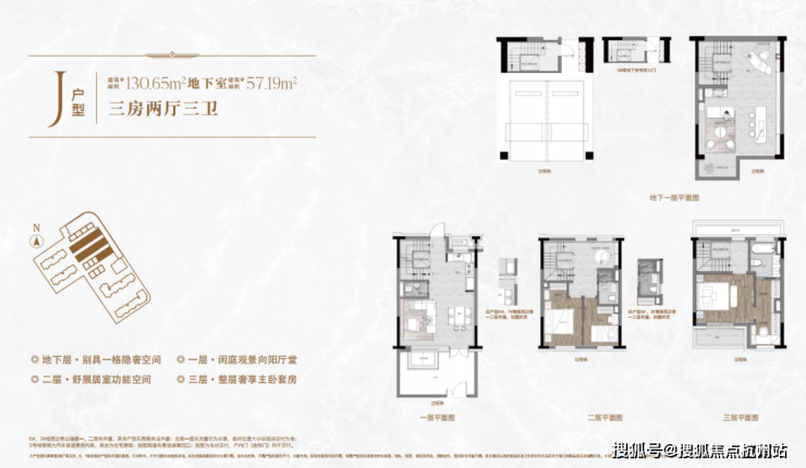 一楼和地下室主社交和志趣,二楼是子女的房间,三楼是主人休憩区。