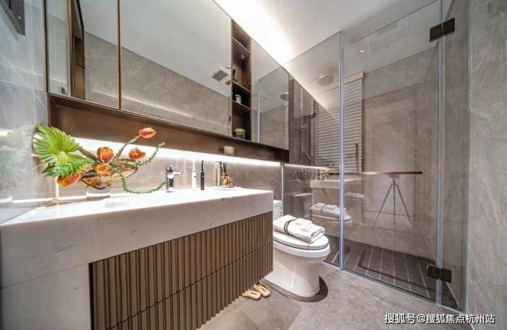 卫生间镜柜也延伸至马桶上方,精心设计了壁龛收纳,整体设计感更强、几乎将收纳做到了极致!