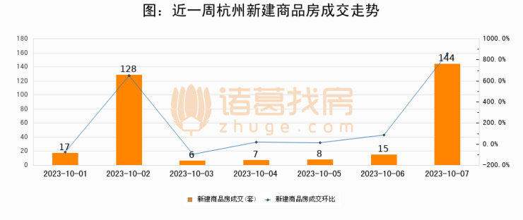 根据杭州市住房保障和房产管理局数据显示,2023年10月07日杭州新建商品房成交144套,较昨日增加129套,环比上涨860%