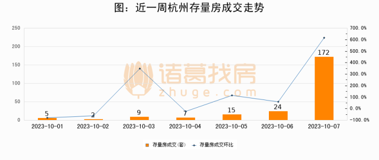 从存量房来看,2023年10月07日杭州存量房单日成交172套,比昨日增加148套,环比上涨616.7%。从近一周存量房成交来看,杭州存量房日均成交套数为33套,10月07日单日成交172套,高于近一周平均水平421.2%。