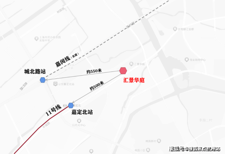 直线距离约600米范围内分布了2个地铁站点!并可分别触达11号线及嘉闵线(在建中)。