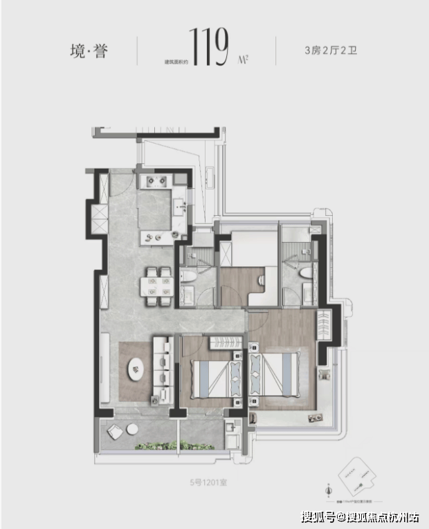 约112/119㎡配备美诺4件套厨电(含油烟机、灶具、蒸烤一体机、洗碗机)、大金中央空调+地暖+霍尼韦尔新风系统三大件,并搭载华为全屋智能控制系统。