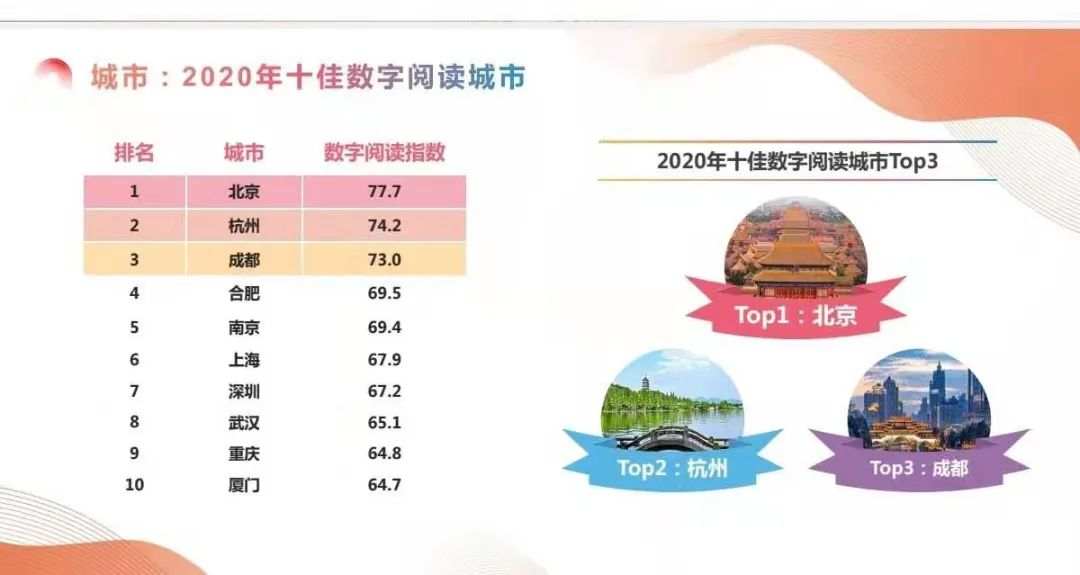 北京、杭州、成都、合肥、南京、上海、深圳、武汉、重庆、厦门等获评十佳数字阅读城市。杭州市再次蝉联全国十佳数字阅读城市称号,阅读指数排名仅次于北京,跃居全国第二。