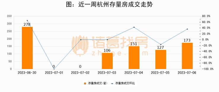 从存量房来看,2023年07月06日杭州存量房单日成交173套,比昨日增加46套,环比上涨36.2%。从近一周存量房成交来看,杭州存量房日均成交套数为119套,07月06日单日成交173套,高于近一周平均水平45.4%。