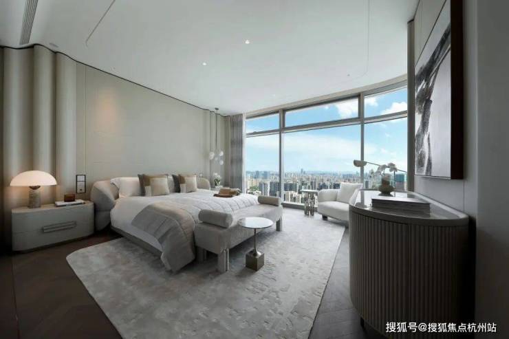 大尺度的高效利用,也让EIC大平层呈现出更多超越此前的空间享受。南向三个套房,24米的开间,停得下4辆加长林肯。进入主卧,罕见的主卫双开门设计,比一般人的主卧都要大,鱼肚白通顶,劳芬捷仕满配,甚至连公卫都是劳芬智能马桶,在这里泡澡,根本不用考虑窗帘。