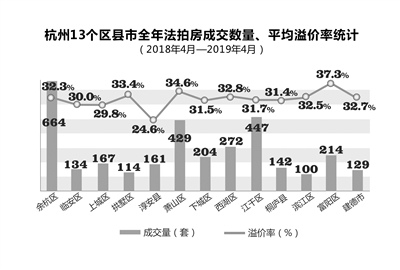 2018年4月-2019年4月的法拍大数据显示:一年时间内,杭州共成交了3177套法拍房,13个区县市的法拍房成交溢价率,基本都在30%左右。