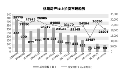 今年4月份,杭州线上拍卖市场“量价齐跌”,成交套数89套,比3月份下跌16.04%;成交均价为21201元/平方米,比3月份下跌20.27%。