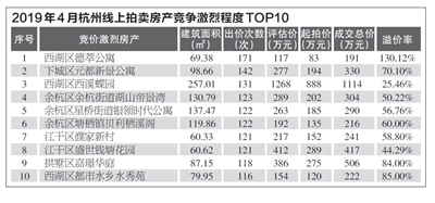 从4月杭州线上拍卖房产竞争激烈程度TOP10来看,7成房源来自主城区。位列前三的分别是西湖区和下城区100平方米以内的户型,以及一套西湖区的千万豪宅。