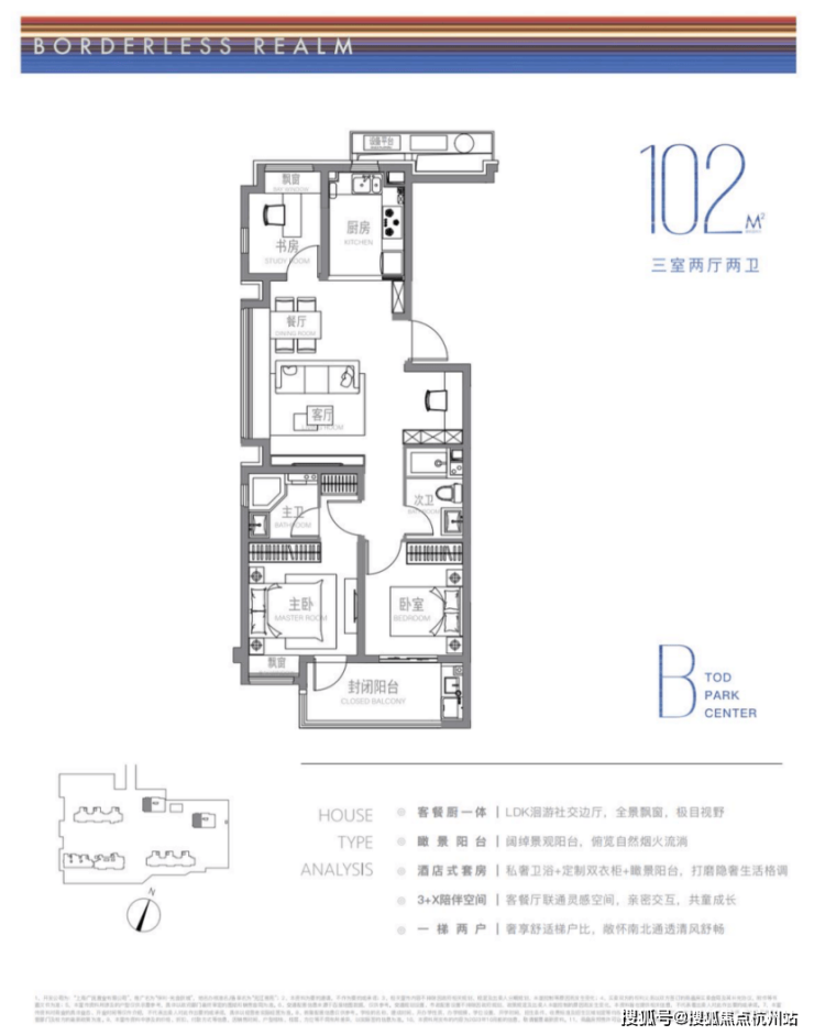 建面约102m²户型特点:LDK洄游式景观边厅,景致拉满,3+X陪伴空间,承载更多自定义功能需求,开放式厨房,烹饪与客餐厅无界互动。