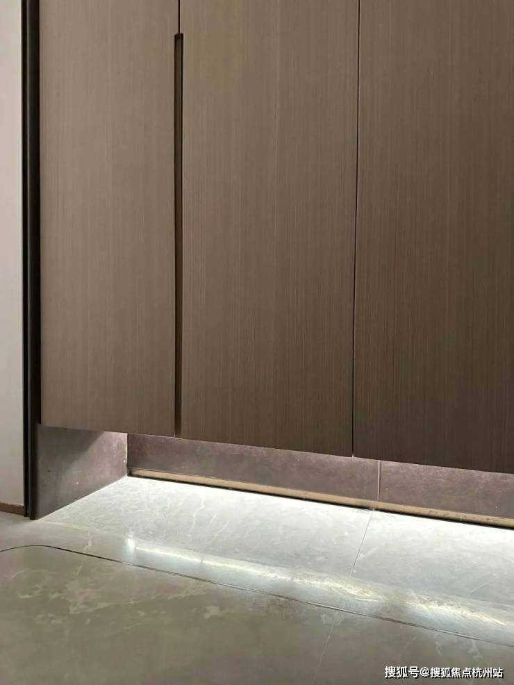 鞋柜下方做了悬浮处理,同样也是内嵌灯带,这里灯光的角度还会再调整,因为灯光映射在大理石地面上,要显得尽量柔和不刺眼;同时,鞋柜下方可放拖鞋,还能放扫地机器人,便于日常清扫打理。