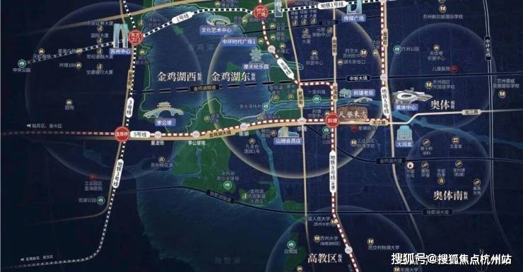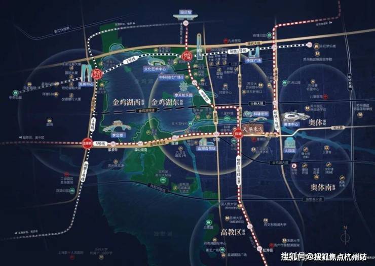 双轨交汇 黄金四角环湖四轨交汇,缔造金鸡湖黄金四角,西北-东方之门、东北-时代广场、西南-李公堤、东南斜塘老街一黄金四角所在核芯价值所向。