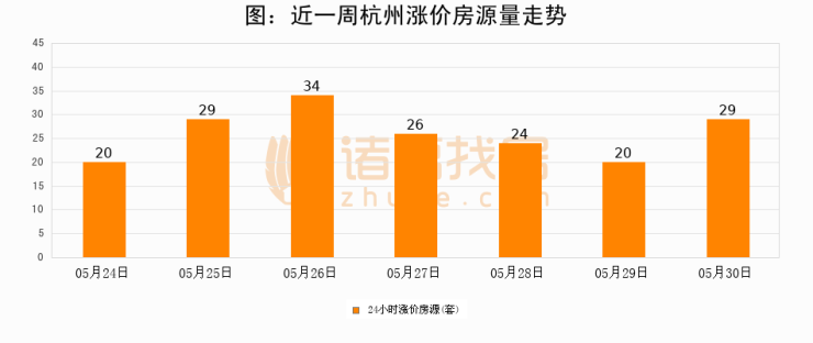 根据诸葛找房数据显示,杭州24小时涨价房源量为29套,较05月29日增加9套,环比上涨45%。与此同时,涨价房源占比小幅扩大,业主信心有所提升。