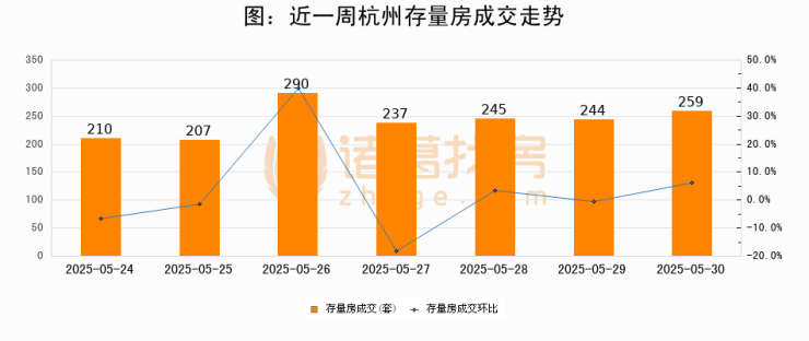 从存量房来看,2025年05月30日杭州存量房单日成交259套,比昨日增加15套,环比上涨6.2%。从近一周存量房成交来看,杭州存量房日均成交套数为241套,05月30日单日成交259套,高于近一周平均水平7.5%。