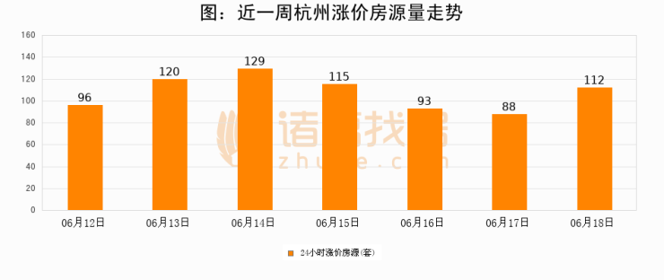 根据诸葛找房数据显示,杭州24小时涨价房源量为112套,较06月17日增加24套,环比上涨27.3%。与此同时,涨价房源占比小幅扩大,业主信心有所提升。