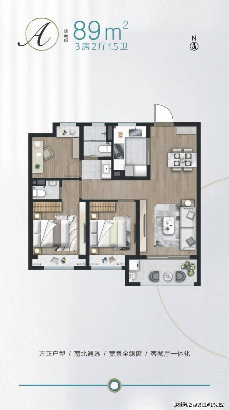 建面约89㎡3房,户型方正,三开间朝南。餐客厅一体,连通阳台,采光通风俱佳。全卧飘窗,主卧套房设计,提升了舒适度。1.5卫设计更加人性化,便于使用。