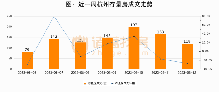 从存量房来看,2023年08月12日杭州存量房单日成交119套,比昨日减少44套,环比下降27%。从近一周存量房成交来看,杭州存量房日均成交套数为138套,08月12日单日成交119套,低于近一周平均水平13.8%。