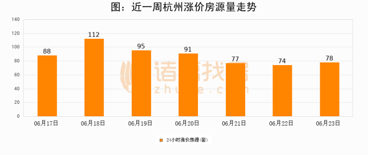 根据诸葛找房数据显示,杭州24小时涨价房源量为78套,较06月22日增加4套,环比上涨5.4%。与此同时,涨价房源占比小幅扩大,业主信心有所提升。