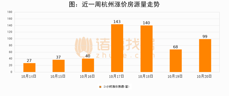 根据诸葛找房数据显示,杭州24小时涨价房源量为99套,较10月19日增加31套,环比上涨45.6%。与此同时,涨价房源占比小幅扩大,业主信心有所提升。