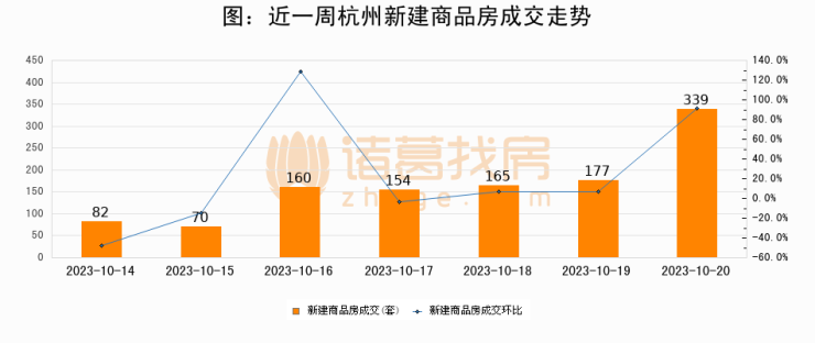 根据杭州市住房保障和房产管理局数据显示,2023年10月20日杭州新建商品房成交339套,较昨日增加162套,环比上涨91.5%