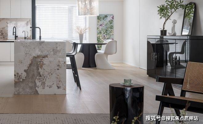 原餐厅区域作为中转区,增设了3米左右的互动式西厨岛台,充足的收纳和操作台面让空间的合理利用与简洁有序相得益彰。