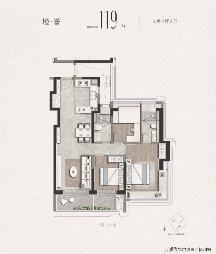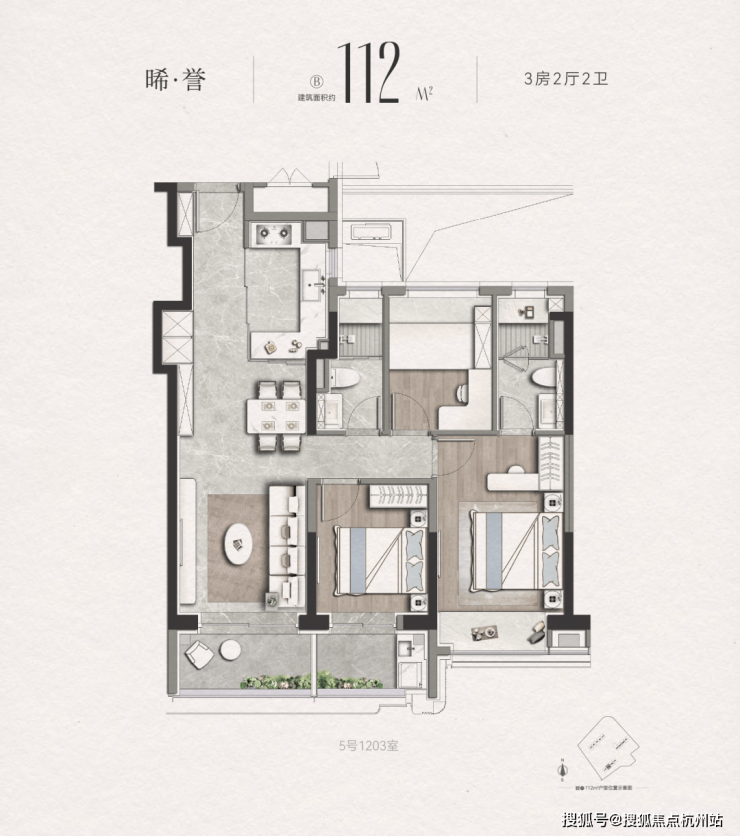 边套A户型是三面采光户型,客厅连接阳台,视野出众。