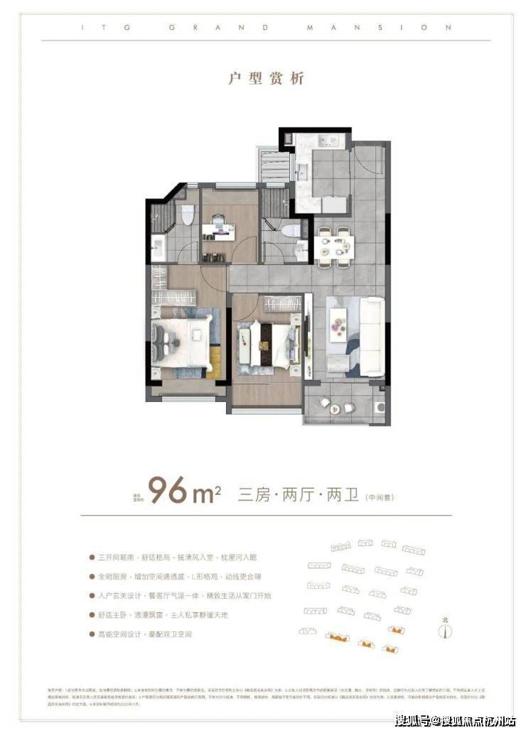 户型方面:约85-96㎡的全三房设计,每一款户型都是会传递出国贸的产品观。南北通透,布局考究,动静分离。