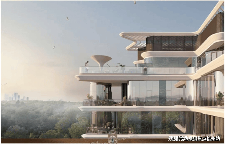 在立面形态上,打破天地的平面想象,告别砖石的沉重,将建筑美学与生活奢享深度融合, 以“垂直立体”的流瀑五叠设计,让建筑如水流般层层递进、光影通透。 更难得的是,流瀑五叠并非只为视觉服务,更是为每一层创造不同的观景视角和光影体验,让每一户都拥有独属自己的那一抹天光。