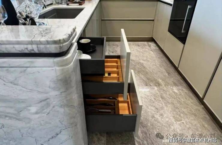 采用怡口直饮水、铂浪高水槽及龙头,水槽口内嵌厨余粉碎机,内里使用硬度堪比钻石的石英石材质。