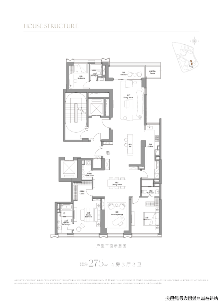 3. 建面约280㎡五居室:顶豪风貌户型,适合塔尖家庭或文化收藏爱好者。户型采用双庭院设计,入户庭院与侧院相连,空间开阔,可打造园林景观;客厅与餐厅分离,形成独立的社交空间,面宽约8.5米,朝南,带全景落地窗,视野开阔;双主卧套间设计,均朝南,配备独立卫生间、步入式衣帽间与书房,满足主人与长辈的居住需求;三个次卧均为全明设计,配备独立卫生间,可作为儿童房、客房或健身房;中西双厨设计,配备国际一线品牌厨电,同时配备独立家政间、储藏室与酒窖;屋顶带超大私家露台,可俯瞰苏州河景观与城市风貌,兼具居住舒适度与文化收藏价值,总价约7000万起。
