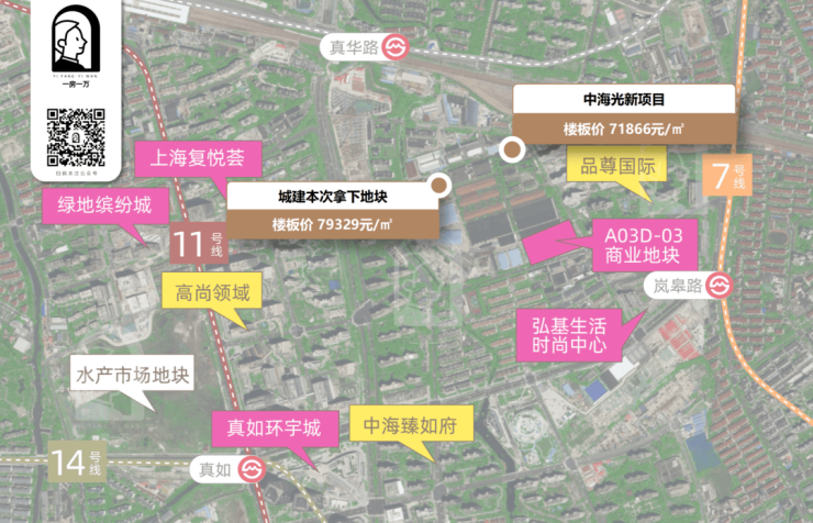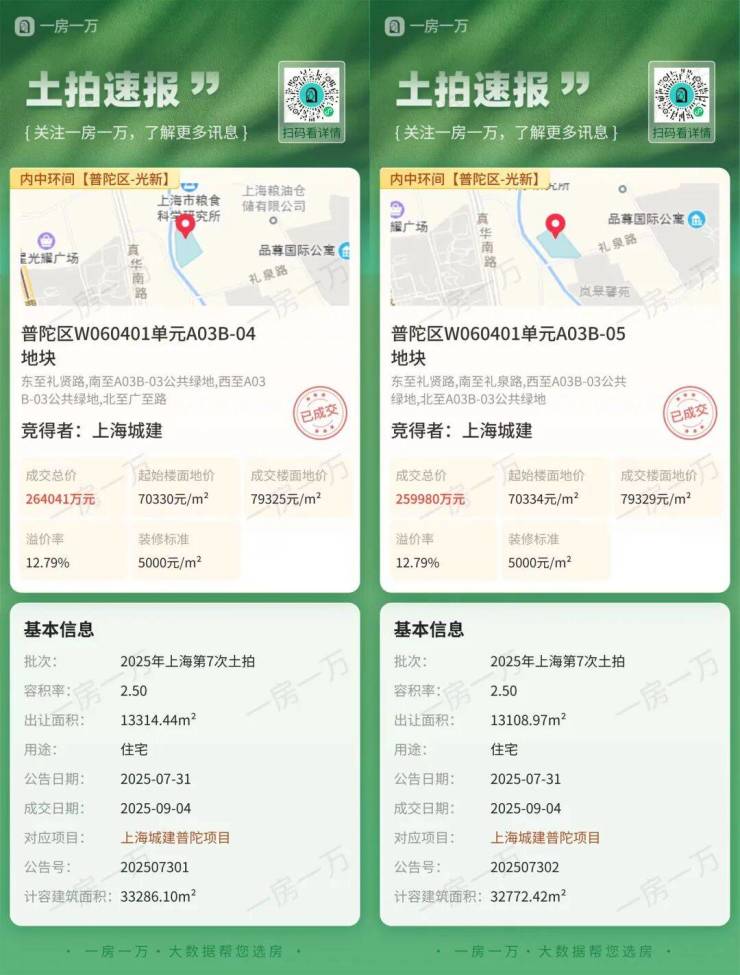 9月4日,上海城建以总价524000万元竞得普陀真如翠谷地块溢价率12.79%,楼板价79324元/㎡,装修标准5000元/㎡。