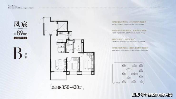 · 建面约89㎡户型则做到了3房的功能性,且三开间朝南+动静分区,设计水准颇高!