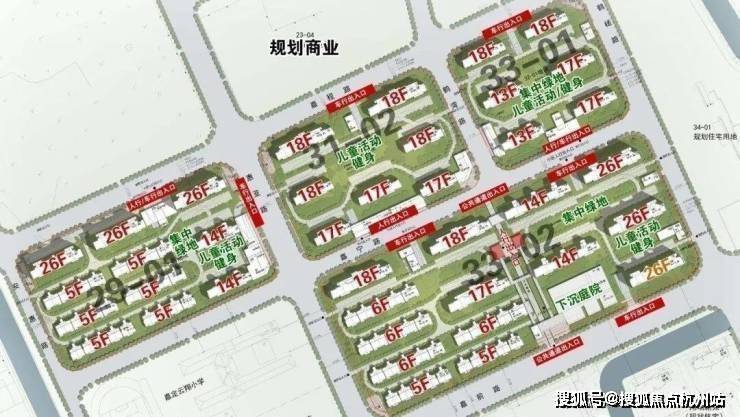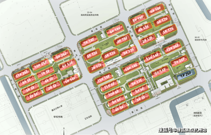 根据公示图显示,该项目的4个小板块最高层为项目东南角和西北角的26层高层,共有6栋,高度接近地块限高的80米(77.80米);18层的共有8栋;17层共有6栋;14层共有4栋;13层共有2栋;6层的共有4栋;5层的共有8栋。