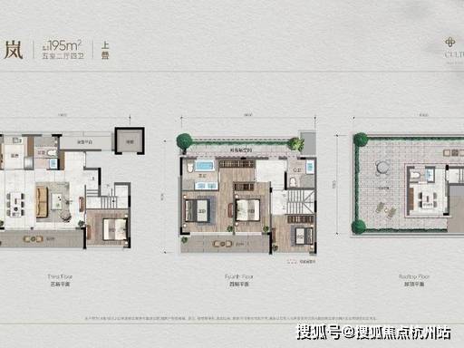 建面约 195㎡上叠,五房两厅四卫,望岚户型,楼王户型设计,拥有更大的观景视野与采光面。南向面宽可达约 10.7 米,三开间朝南,让每个房间都能享受阳光与美景。客餐厅横厅设计,空间感十足,连接 270° 观景露台,尽揽社区园林与茶山的自然画卷,阁楼可变儿童乐园或艺术家工作室,功能性极强。