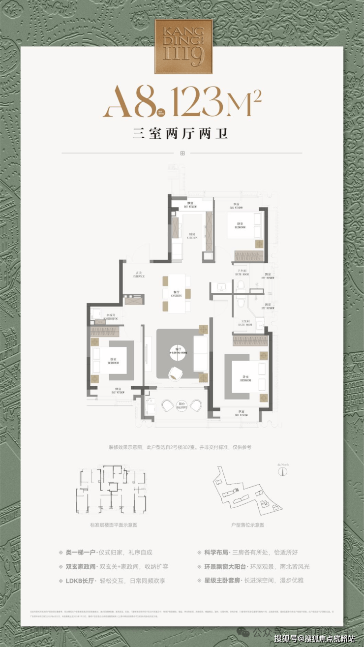 建面约123㎡三房户型,飞机式布局,一镜到底的LDKB长厅,尽显隐贵静安风范;