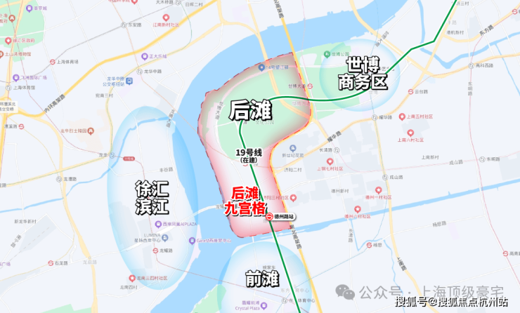 后滩九宫格北接世博文化公园、南邻前滩,西面隔黄浦江就是徐汇滨江,区位非常好,且是黄浦江核心段硕果仅存的滨江住宅区。