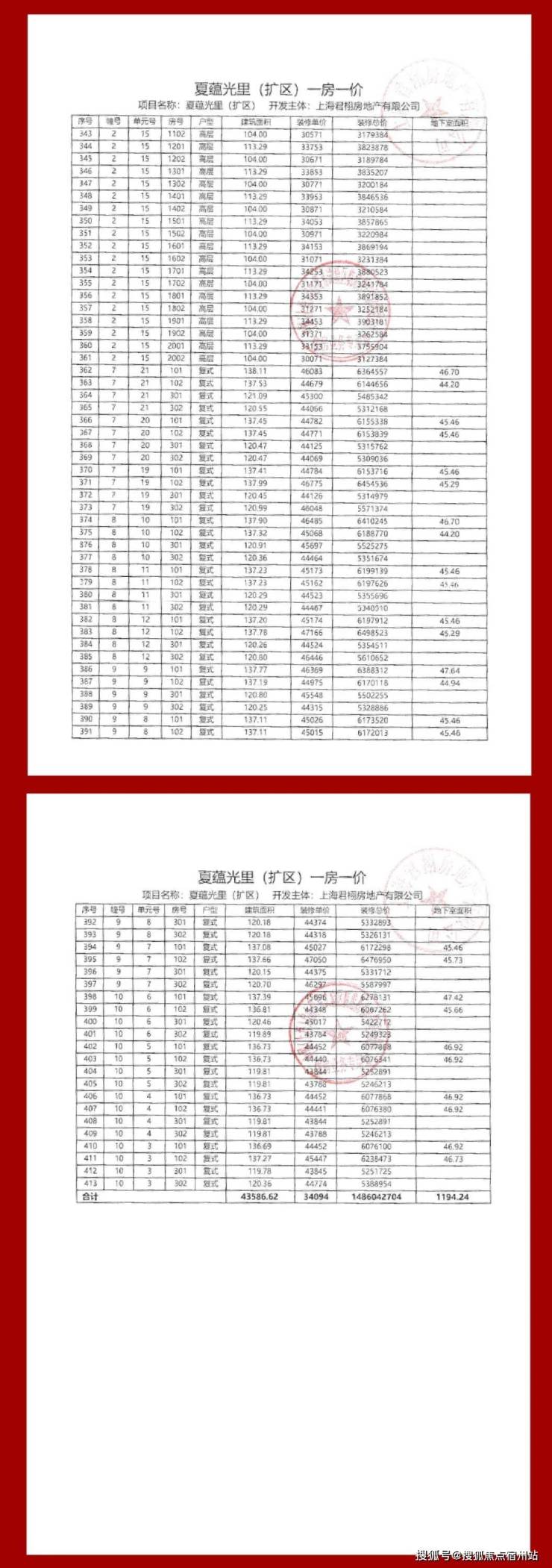 项目一房一价表