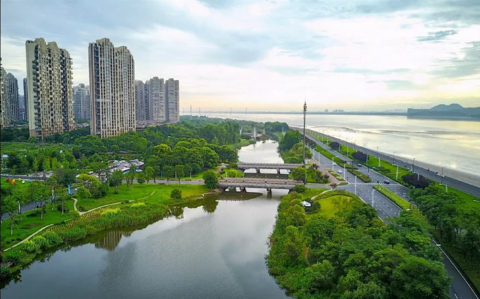 沿途景观:钱塘江潮水、沿江湿地、江东大桥、下沙大桥、下沙高教园