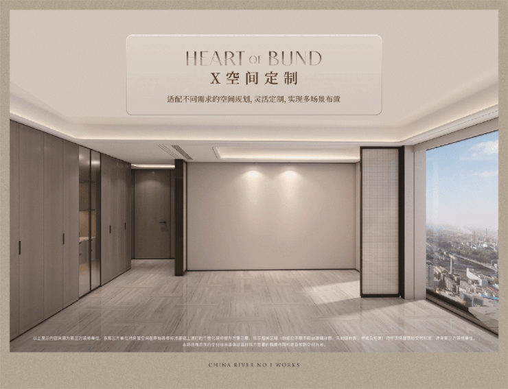 以黄浦江为灵感,营造“阅尽千帆后的宁静与松弛感“!通过8.5米南向宽厅、270°环幕玻璃、无冗余装饰的减法美学,让空间如江面般舒展,视野极度开阔!