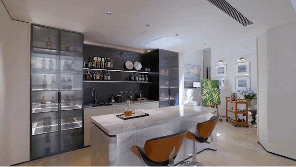 延伸出的"早C晚A"魔法空间,藏着都市人的生活仪式感:清晨,胶囊咖啡机吐出第一缕醇香,骨瓷杯沿的奶沫画出心形拉花;入夜,威士忌酒柜的柔光亮起,水晶杯折射出琥珀色的微醺时刻!