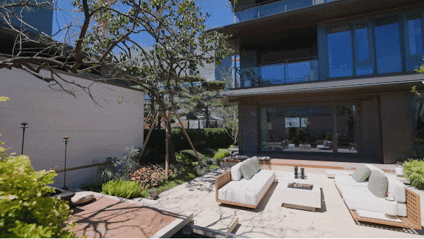 沿风雨连廊漫步,耳畔是流水淙淙,眼前是叠石苍松!约460㎡下沉庭院不像景观,更像一幅您就在其中的立体宋画,一草一木,都可触摸、可对话!