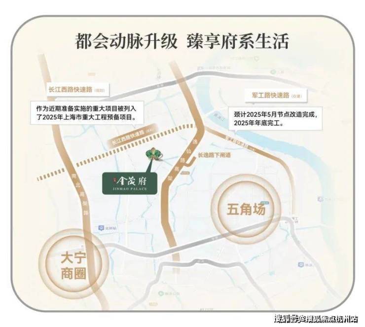 在城市交通路网方面,江湾金茂府同样优势显著。周边拥享中环高架、长江西路快速路、外环高速三横主轴,以及逸仙路高架、南北高架两纵接驳 。