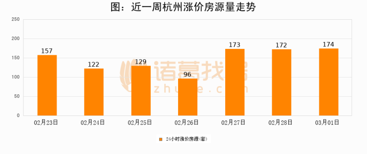 根据诸葛找房数据显示,杭州24小时涨价房源量为174套,较02月28日增加2套,环比上涨1.2%。与此同时,涨价房源占比小幅扩大,业主信心有所提升。