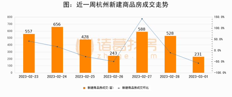 根据杭州市住房保障和房产管理局数据显示,2023年03月01日杭州新建商品房成交231套,较昨日减少297套,环比下降56.2%。近一周杭州新建商品房日均成交469套,其中,02月24日成交量最高为656套。03月01日单日成交231套,低于近一周平均水平50.7%。