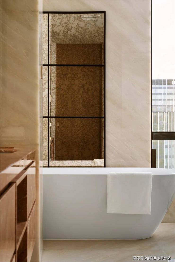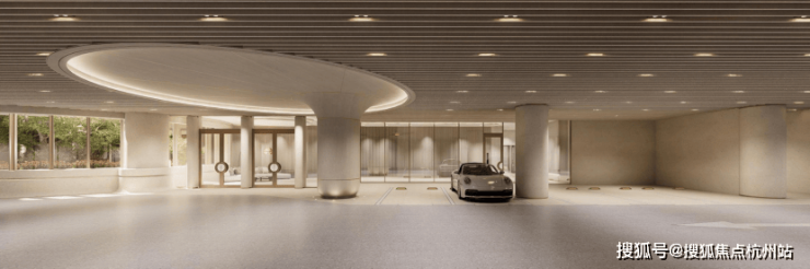 底部以石材和金属结合的曲线异形巨柱抬高建筑体量,构筑了廊柱与动态景观空间 ,既满足了尊贵的入户大堂需求,又释放了底层空间的潜力,进一步提升了低层住宅的采光效果和视野范围,从而营造出更为宜人的居住环境。