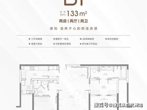 B1 户型|133㎡ 2 房 2 厅 2 卫:三开间朝南 + 宽景南向阳台,南向双套房,客餐厅一体化,空间通透开阔,适配高端改善家庭。
