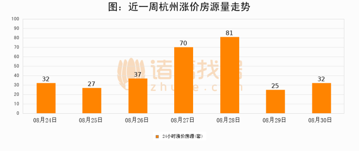 根据诸葛找房数据显示,杭州24小时涨价房源量为32套,较08月29日增加7套,环比上涨28%。与此同时,涨价房源占比小幅扩大,业主信心有所提升。
